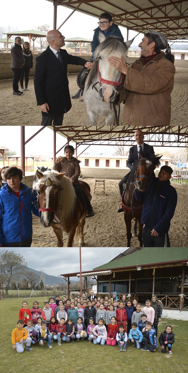 Sarayköy Belediyesi Sosyal Etkinlik Merkezi’nde eğitim alan ilkokul 3. ve 4. Sınıf öğrencilerini yarı yıl tatilinde at çiftliğine götüren Başkan Özbaş, ilk kez at binecek olan öğrencilerin korkularını yenmesi için kendisi de ata bindi, öğrencilere eşlik etti.