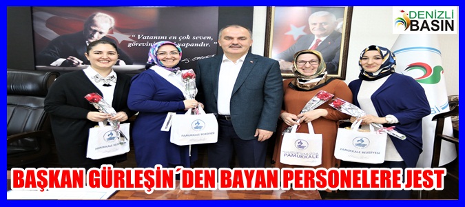 Pamukkale Belediye Başkanı Hüseyin Gürlesin, 8 Mart Dünya Kadınlar Günü nedeniyle belediyede çalışan bayan personeline çiçek ve hediyeler takdim etti. Başkan Gürlesin, “İlçemize hizmet verme yolunda birlikte çalıştığımız bayan personellerimizin bu anlamlı günlerini kutladık” dedi.