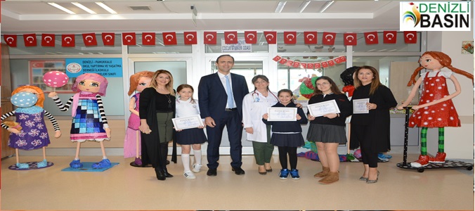 PAÜ Hastanesi Çocuk Hastalıkları katına ODTÜ Geliştirme Vakfı Özel Denizli Okulları öğrencileri geri dönüşüm atıklarından yaptıkları çocuk heykellerini hediye ettiler.