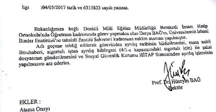 Prof. Dr. Hüseyin Bağ, Milli Eğitim Bakanlığı’na 4 Mayıs’ta yazı yazdı: “Bakanlığınıza bağlı Denizli Milli Eğitim Müdürlüğü Bereketli İmam Hatip Ortaokulu’nda öğretmen kadrosunda görev yapmakta olan Derya Bağ’ın üniversitemiz İslami İlimler Enstitüsü’ne tahsisli Enstitü Sekreteri kadrosuna naklen ataması yapılmıştır. Adı geçene tebliğ edilerek görevden ayrılış tarihinin bildirilmesini, maaş nakil ilmühaberi, sigortalı işten ayrılış bildirgesi (4/1-c kapsamındaki sigortalı için) ile şahsi dosyasının gönderilmesini ve Sosyal Güvenlik Kurumu HİTAP sisteminden ayrılış işleminin yapılmasını arz ederim.”
