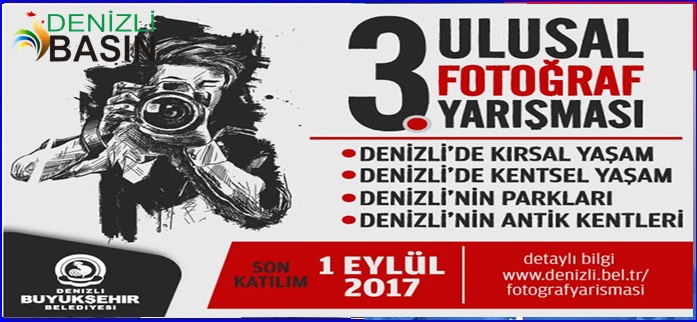 Denizli Büyükşehir Belediyesi 3. Ulusal Fotoğraf Yarışması başladı. Denizli il sınırları içindeki parklar, doğal, tarihi ve kültürel güzellikler ile kentsel ve kırsal yaşamı anlatan eserlerin katılacağı yarışma 4 ayrı kategoride düzenlenecek. "Denizli’nin Parkları", “Denizli’de Kırsal Yaşam”(Köylerde tarım, hayvancılık, gelenekler, bayramlar, düğünler, evlerde ve sokaklarda yaşam), "Denizli’de Kentsel Yaşam” (Kent içinde, evlerde, çarşı-pazarlarda, eğlence yerlerinde, Cadde ve sokaklarda ve benzeri yerlerde yaşam) ve "Denizli’nin Antik Kentleri" kategorilerinde düzenlenecek yarışmaya gönderilecek fotoğraflar 2014-2017 yılları içinde Denizli ili ve ilçelerinde veya köylerinde çekilmiş olacak.
