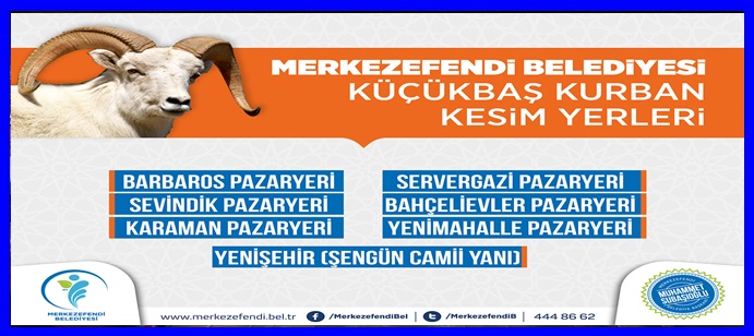 Eylül ayının 1’nde başlayacak olan Kurban Bayramı için Merkezefendi Belediyesi hazırlıklarını sürdürüyor. Yapılan hazırlıklar çerçevesinde Merkezefendi Belediyesi tarafından belirlenen kurban kesim yerleri açıklandı. Buna göre ilçede belirlenen 7 noktada hijyenik koşullarda vatandaşlar kurban kesimi yapabilecek.