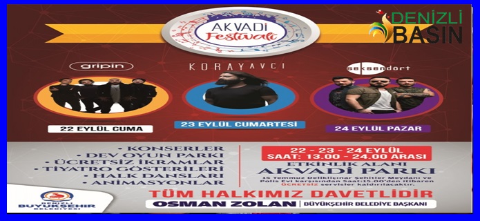 Denizli Büyükşehir Belediyesi, 3 gün sürecek dev bir festivale imza atıyor. Ege'nin en büyük parkı Ak Vadi'de düzenlenecek festivalde Gripin, Koray Avcı ve Grup Seksendört sahne alacak. Konserler, dev oyun parkı, tiyatro, halk dansları ve animasyon gösterilerinin yapılacağı Ak Vadi Festivali, 22-23-24 Eylül'de gerçekleştirilecek. Gündüz 13.00'de başlayacak ve birçok stantın açılıp etkinliklerin düzenleneceği festival gece yarısına kadar sürecek.